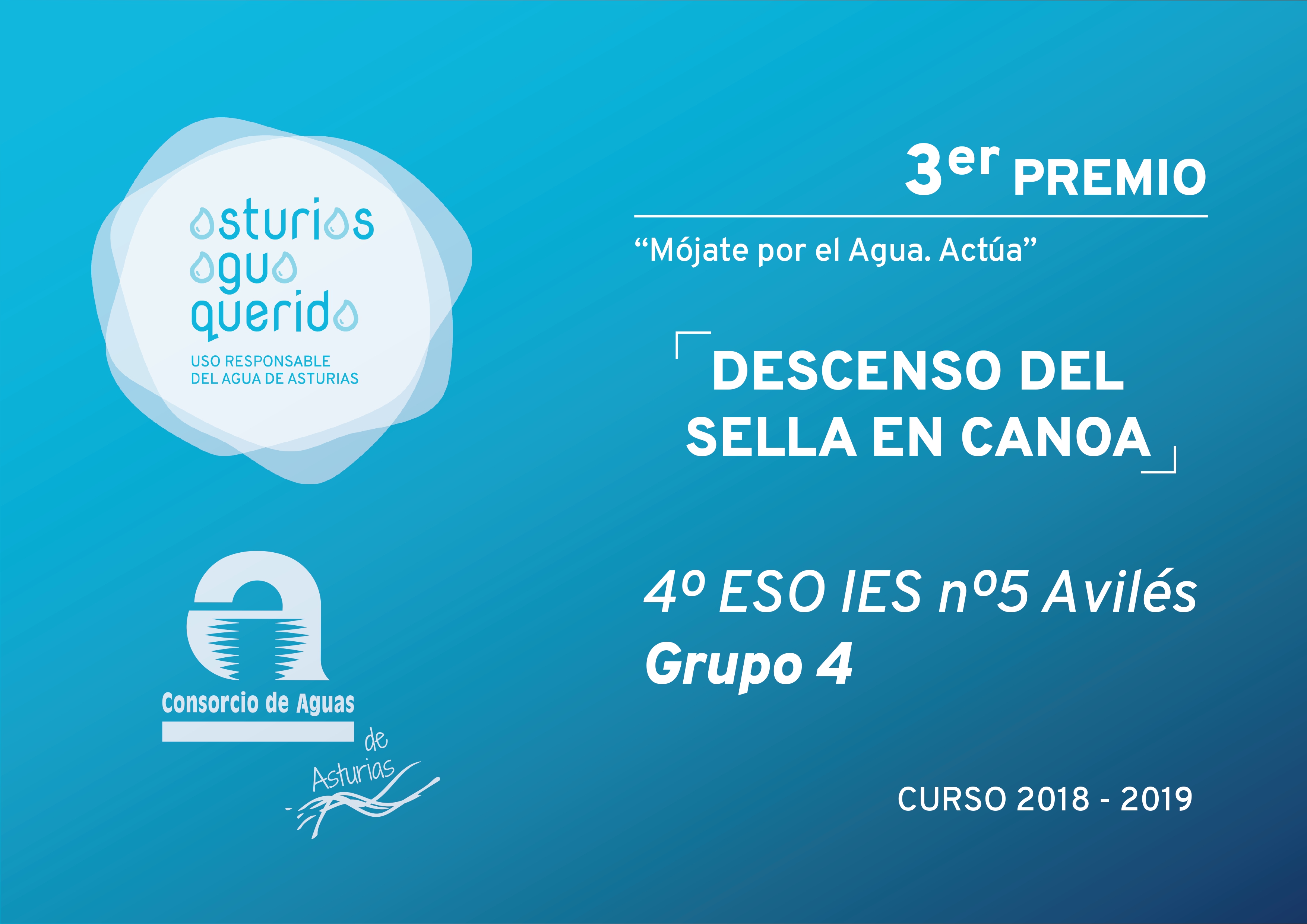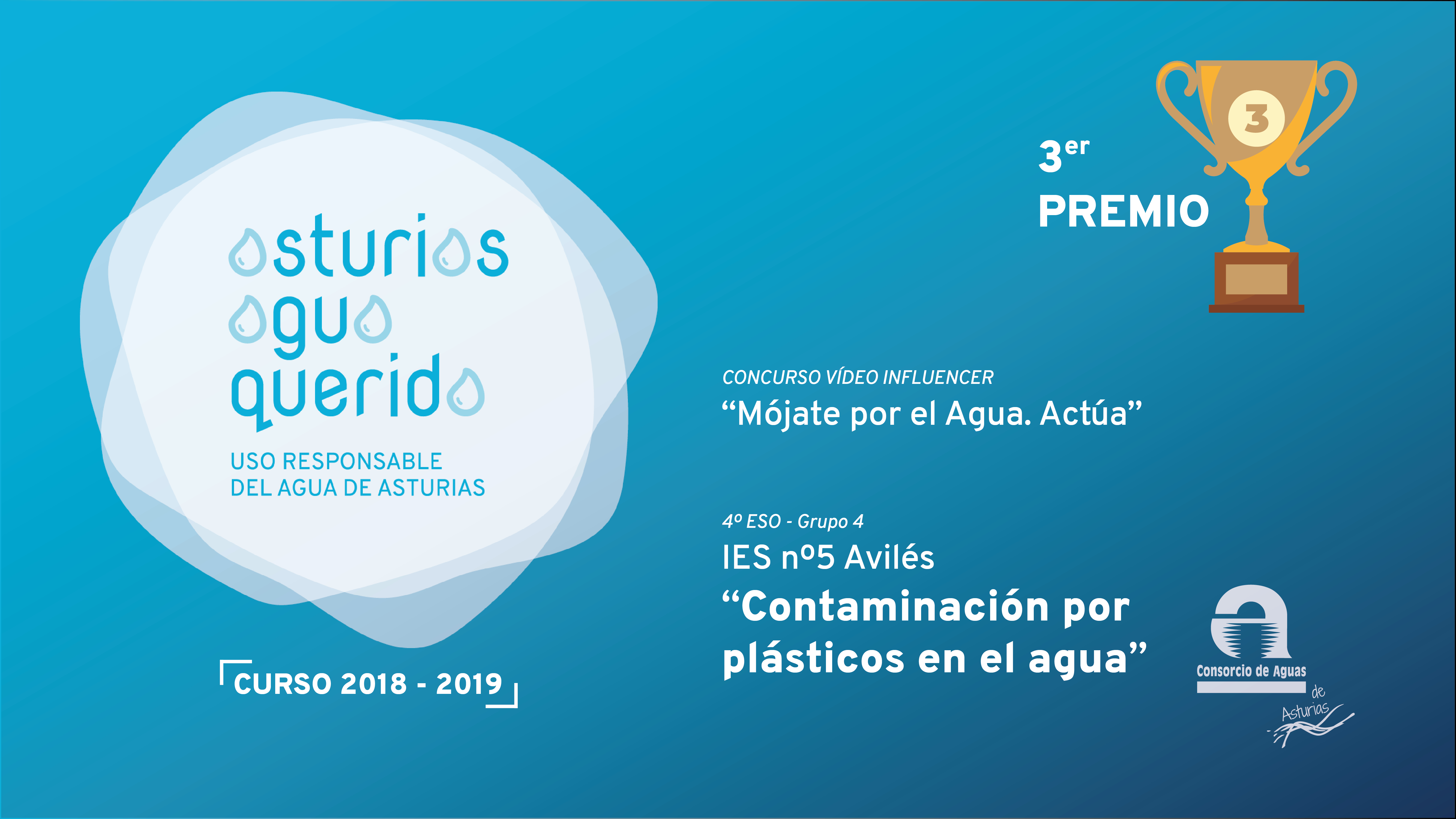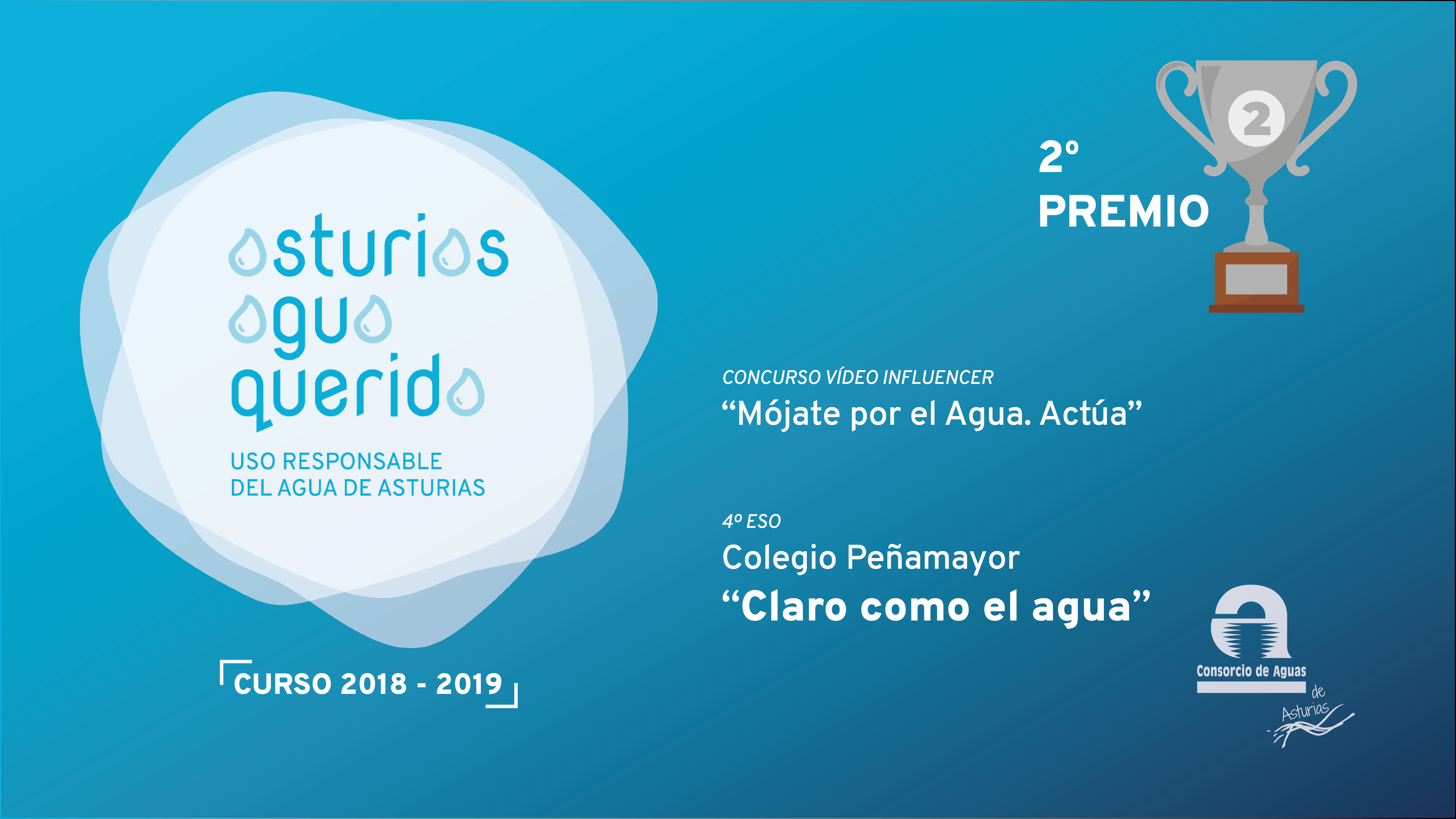Dentro de las actividades previstas para la campaña de educación ambiental “Asturias Agua Querida” organizada por el Consorcio durante el actual curso académico 2018-19 para sensibilizar a los escolares de 4º de la ESO de los colegios que lo solicitaron sobre el uso responsable del agua, mediante la visita a varias instalaciones de la entidad: la Casa del Agua de Rioseco, la Estación de Tratamiento de Agua Potable (ETAP) de Rioseco y la Estación Regeneradora de Aguas Residuales (ERAR) de Baiña, en la cuenca del Caudal, se organizó un concurso de elaboración de “vídeos influencer”, bajo el lema «Mójate por el Agua: Actúa» en el que se premió a los tres mejores bajo los parámetros de originalidad, mensaje, narrativa, sonido y técnica, ponderando mayormente los tres primeros.